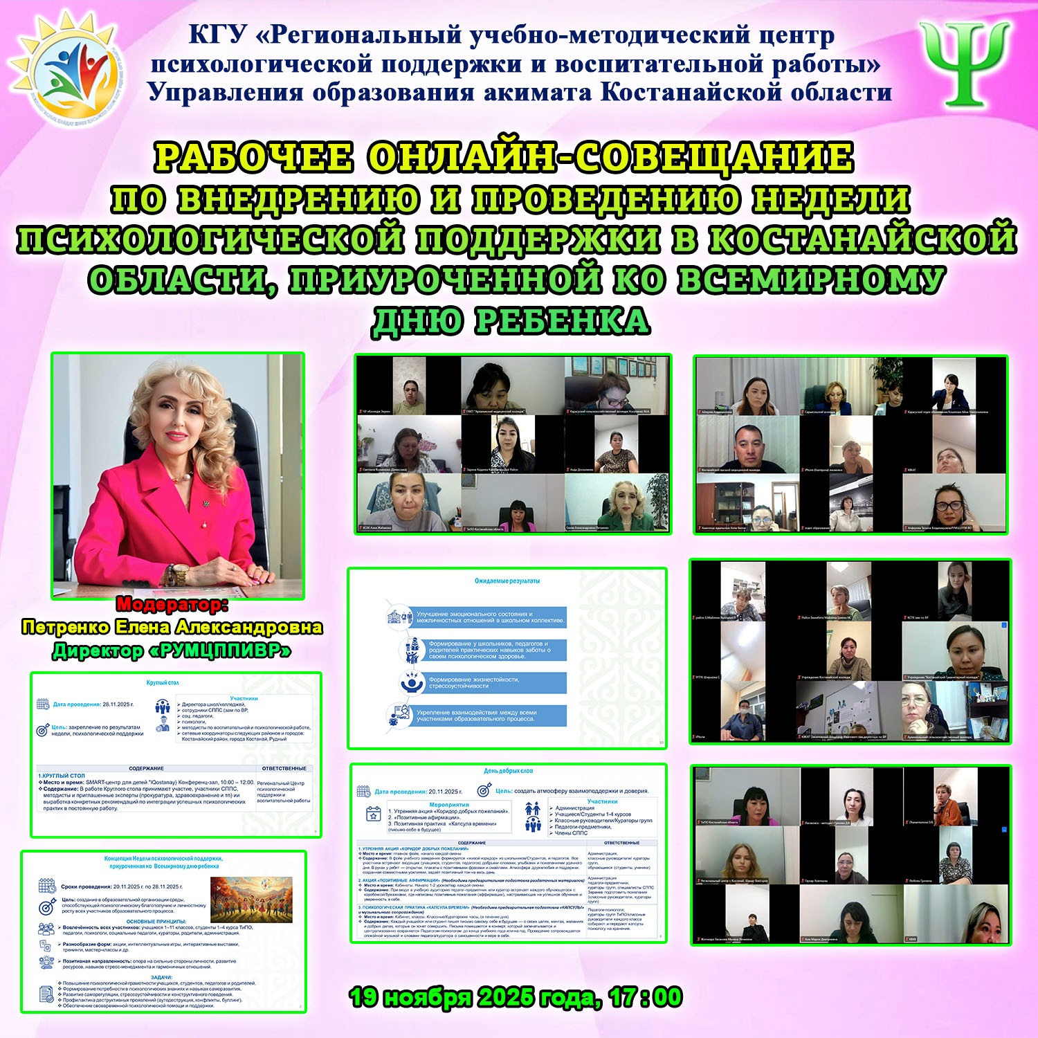 19 ноября провели онлайн-совещание, где мы подробно рассказали психологам учебных заведений, сетевым координаторам и методистам о нашем новом проекте, который планируется сделать традиционным!
